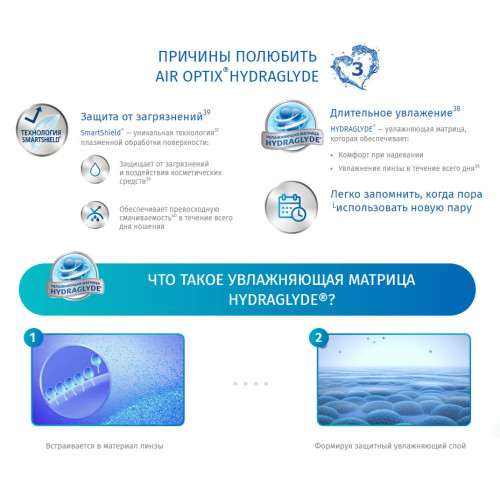 Технология HydraGlyde® для комфорта: Специальный увлажняющий агент встроен в материал линзы, обеспечивая постоянное увлажнение и защиту от сухости в течение всего дня.