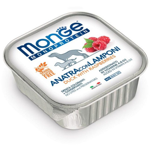 Monge Dog Monoprotein Fruits консервы для собак паштет из утки с малиной. Полноценный рацион для взрослых собак. Ароматный мясной паштет изготовлен из свежего мяса утки с добавлением свежих ягод малины. Консервы линейки Monoprotein для собак могут служить основой исключающей диеты при пищевой аллергии. При изготовлении в состав данного рациона входит только белок утки и спелые ягоды малины, Grain Free формула позволяют легко исключить из рациона ингредиенты, вызывающие аллергию.