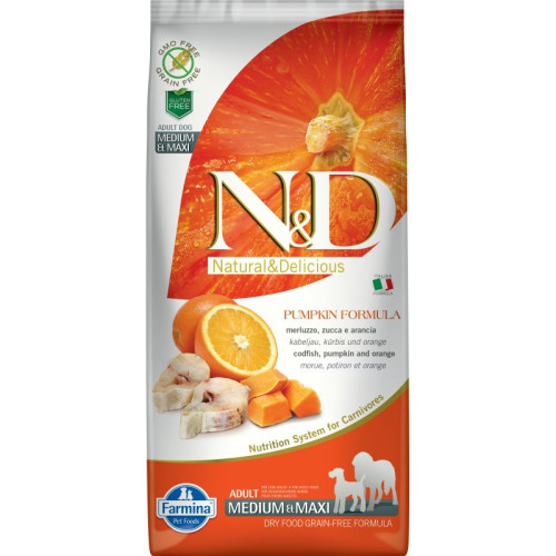 Farmina N&D Dog GF Pumpkin Chicken & Pomegranate Adult Medium & Maxi корм для собак средних и крупных пород. Треска, апельсин, тыква