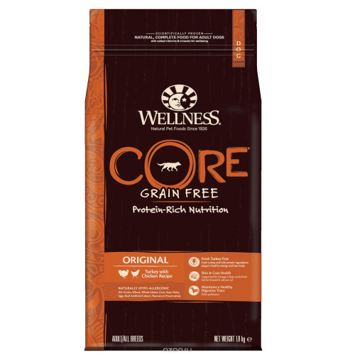 Беззерновой сухой корм для собак Wellness CORE богат белком и витаминами. Корм создан в полном соответствии с потребностями домашних любимцев, которые по сути своей были и остаются хищниками. Именно поэтому все корма Wellness CORE являются беззерновыми, а свежее мясо и рыба - ингредиент №1 во всех рецептурах.