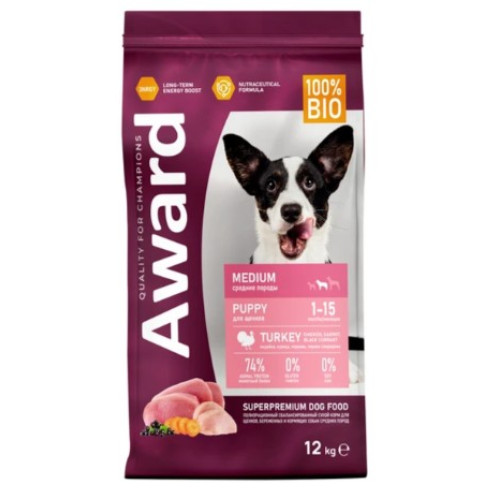 Сухой корм AWARD для щенков от 1 мес, беременных и кормящих сук средних пород с индейкой и курицей с добавлением моркови и черной смородины 2 кг.