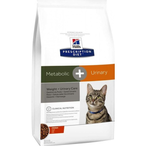Hill'sTM Prescription DietTM Metabolic + Urinary+Stress Feline с Курицей (11%) – полноценный диетический рацион для кошек для снижения веса, растворения струвитов и уменьшения вероятности рецидива струвитного уролитиаза (заболевания нижнего отдела мочевыводящих путей у кошек). Это диетический рацион с пониженной энергетической плотностью и закисляющими мочу свойствами содержит низкий уровень магния.