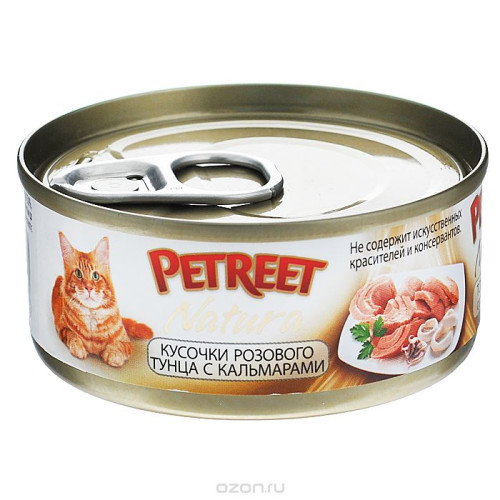 Основу консервов Petreet "Natura" с кусочками розового тунца и кальмарами, нежное розовое мясо стейковой части тунца с добавлением кальмаров. При умеренной калорийности в корме содержится высокий уровень белка (15%).