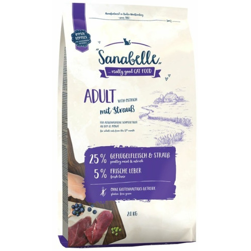 Сухой корм Бош Санабелль Эдалт с Мясом Страуса разработан в соответствии с потребностями взрослых (старше года) кошек для того чтобы они могли сохранять идеальный вес.