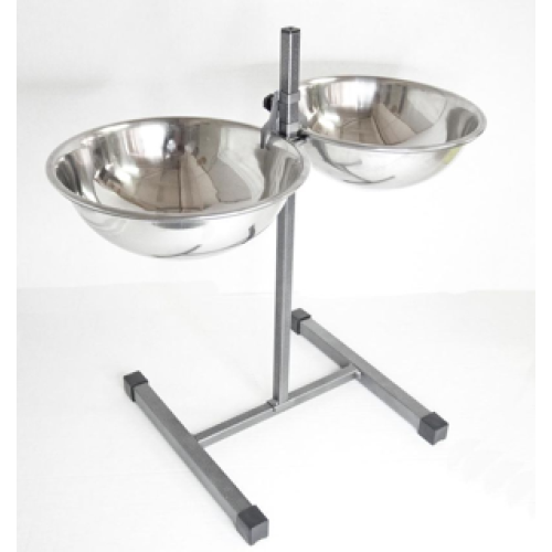 Телескопическая подставка - может плавно изменять высоту расположения мисок. Кроме того, специальный прижим не позволит мискам переворачиваться (исключено расплескивание, загрязнение пола в комнате). Каждый вариант подставки снабжен прорезиненными ножками. Изделия окрашены порошковой краской, нанесенной в электростатическом поле.