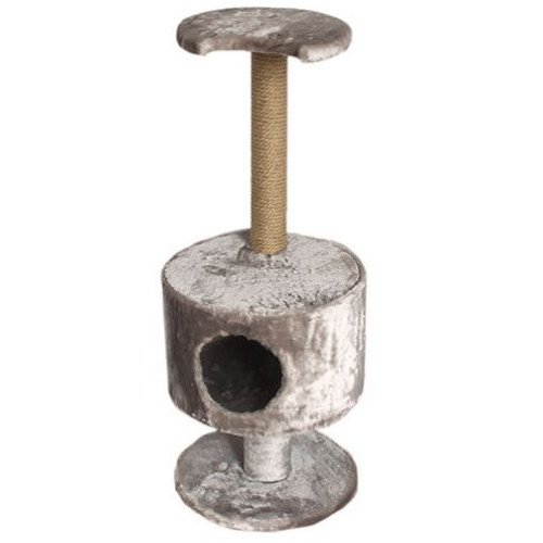 Состоит из пяти элементов: домик, подставка, полка, труба-когтедралка, труба меховая. Домик и подставка круглые, полка фигурная, изготовлены из ДСП и ДВП, обработанные игрушечным мехом.