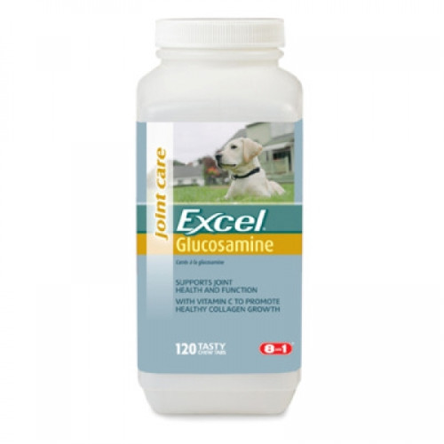 Glucosamine 8 в 1 - 120таб. Для профилактики болезней суставов собак. Данный препарат представляет комплекс, в состав которого входит не только глюкозамин, но и кальций, фосфор, витамин С, важные микроэлементы. Врачи рекомендуют его в качестве профилактического средства растущим щенкам, молодым собакам для укрепления суставов и связок, полноценного развития костяка, сохранения правильного обмена веществ, улучшения шерстного покрова. Как лечебный препарат в период восстановления после заболеваний или травм опрно-двигательного аппарата (переломы костей, болезни суставов, повреждения связок и т.п.).