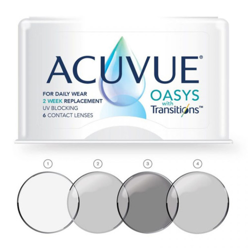Контактные линзы ACUVUE OASYS with Transitions - фотохромные контактные линзы, также предназначены для устранения влияния яркого света на глаза, поскольку в их составе содержится фотохром, который динамически поглощает свет в видимой области спектра