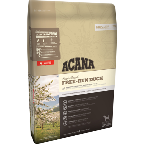 Корм ACANA Free-Run Duck с одним источником белка на 50% состоит из мяса выращенной на свободном выгуле утки, которое доставляется на фабрику свежим и используется в соотношении WholePrey («добыча целиком»). Включенная в состав сублимированная печень привлечет даже привередливых питомцев. А клетчатка, содержащаяся в свежих грушах, мускатной и столовой тыквах, наладит чувствительное пищеварение.